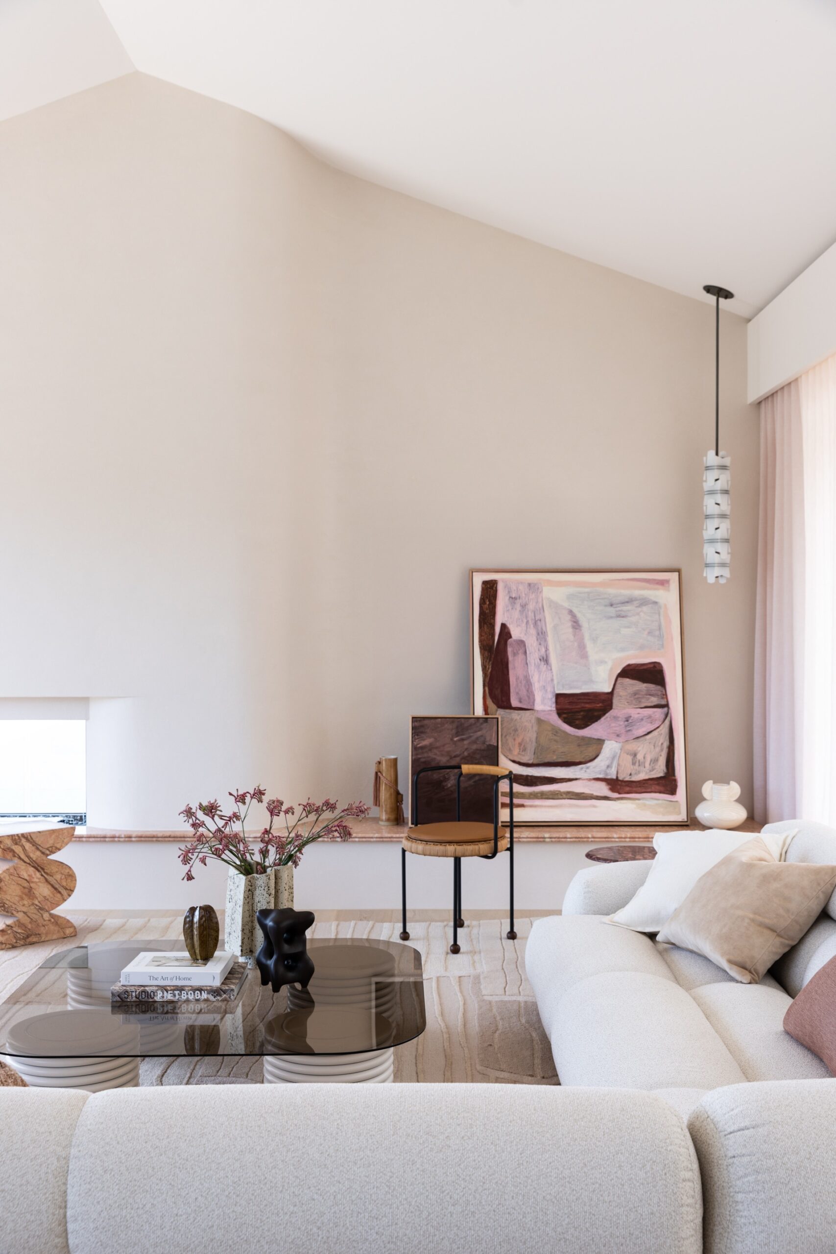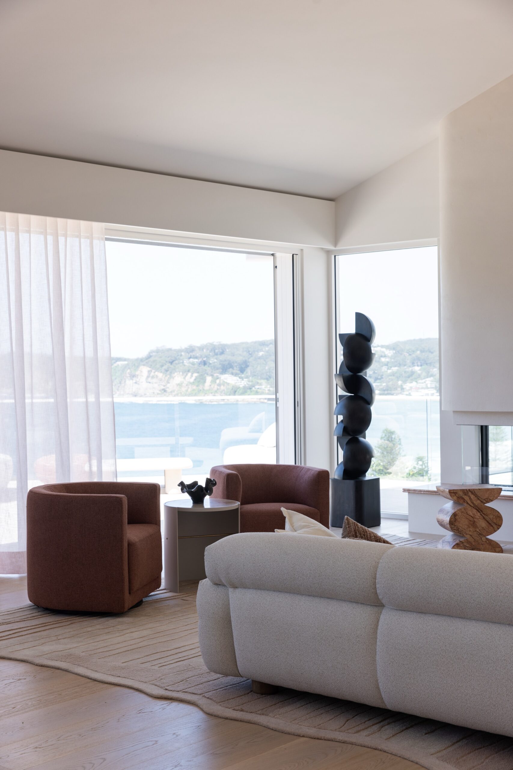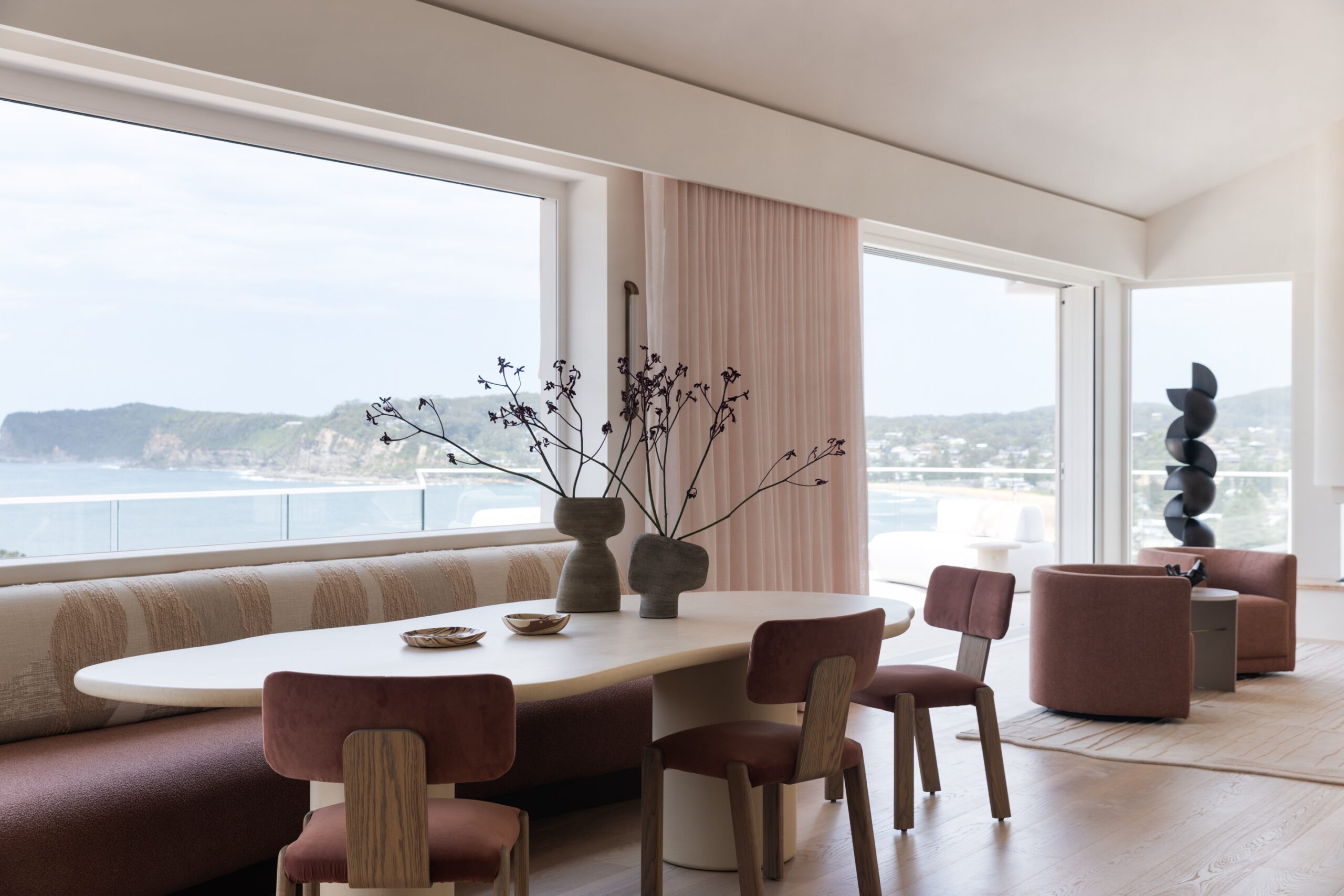 The North Avoca Residence has uninterrupted and sweeping views of the ocean which provides a truly breathtaking backdrop embedded into a tranquil and private setting. Woods and Warner were engaged during the project to refine, curate, and oversee the finishes schedule, creating a design palette that balances simplicity with an unmistakable sense of quiet luxury. The design approach is notably warm and ensures there is a dedication to subtle and textural features. Once the foundations were laid and executed by the building team W&W commenced the design and procurement of furniture, soft furnishings and art. Thoughtfully prepared each space has its own personality yet continuous flow throughout the spaces. The milky almond palette was prioritised for the main living spaces creating a gentle flow, however as you move throughout the zones deeper and more joyful surprises await. Woods & Warners natural ability to transform a house into a home shines through this project. There is a balance of calm yet a striking undertone of modern coastal glamour.